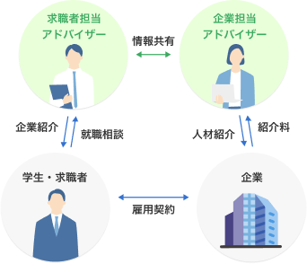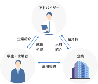 就職エージェントは、企業と求職者の間に立ち、人材の採用・入社につなげることで企業から紹介料をいただくビジネスモデルです。紹介料は企業との契約内容に応じて異なります。