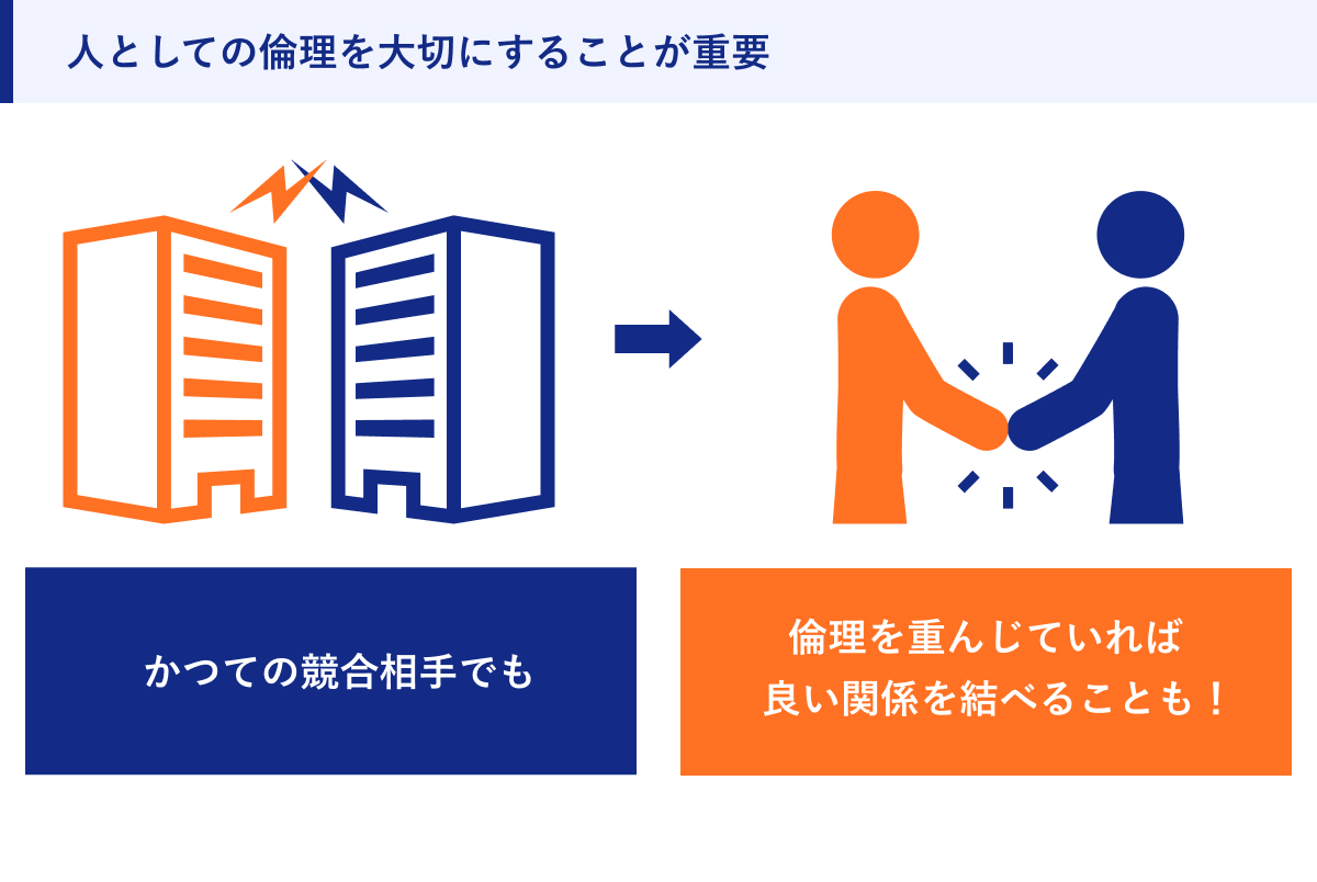 自分の会社を経営して実感するのは、人としての倫理を重んじることの大切さ。というのも、経営をしていると今までのおこないが回りまわってつながっていると感じることが多いのです。たとえば、大学時代の後輩が自社の顧問弁護士になっていたり、ライバルで互いにしのぎを削り合っていた会社が、今や自社の取引先になったり──。かつての敵が今の味方になることも多くありました。