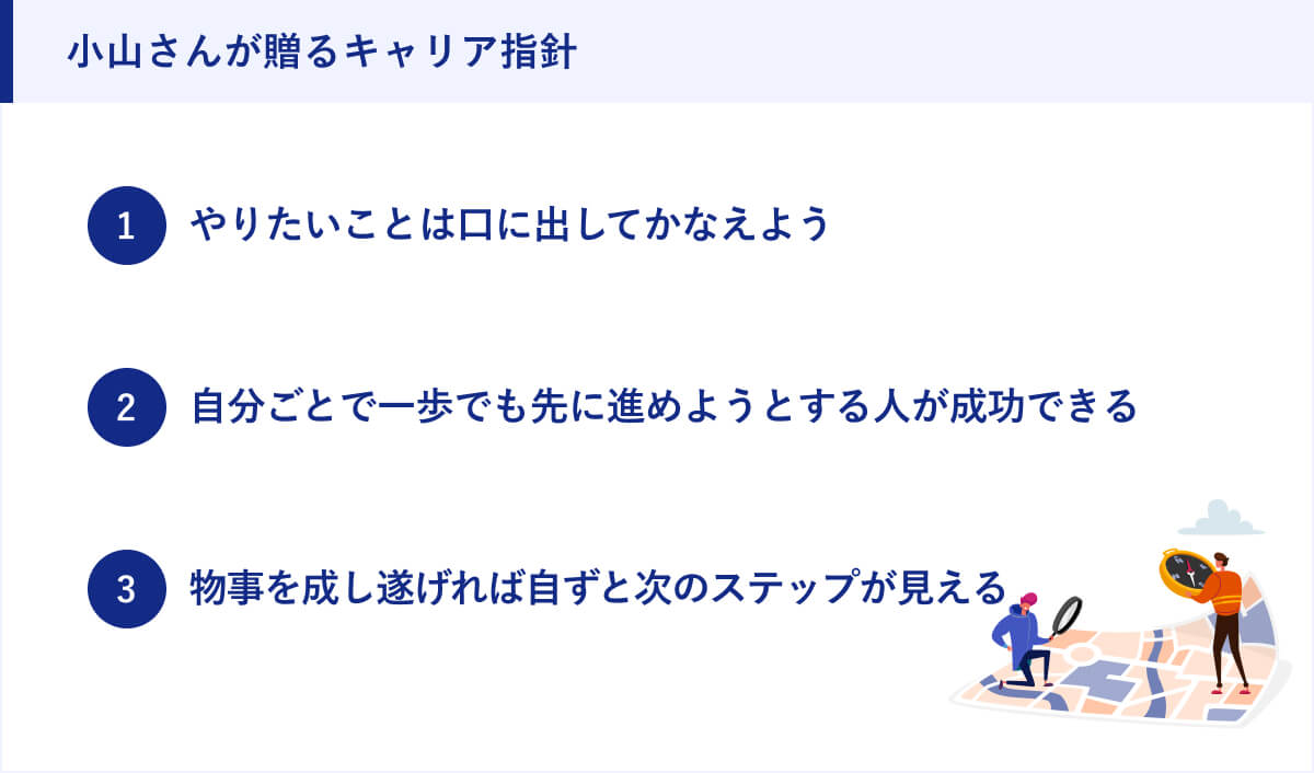 一言で言えば「主体性を持つ」ということなのだと思います。かかわるからにはうまくいくように、全体のなかで自分がやるべきことを全力でやる。いつでもそのスタンスで臨むことが、成功の必要条件なのだと学びました。