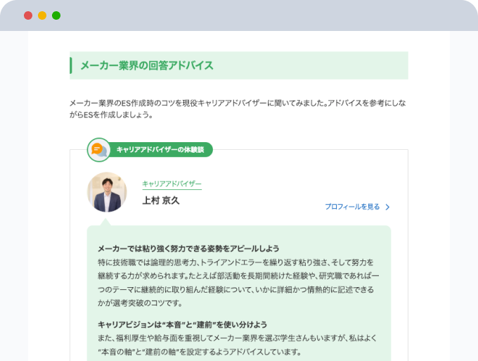 業界別の回答アドバイスや成功談などを参考に、自分のESをより魅力的なものに仕上げましょう。