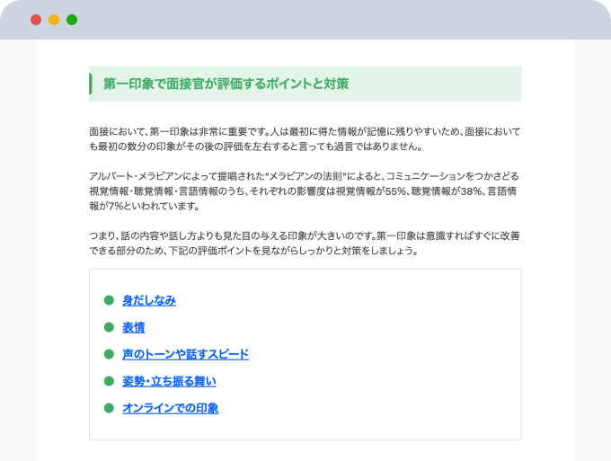 まずは評価シートの項目を確認し、「第一印象」「質疑応答」など、面接官が具体的にどこをチェックしているのかを把握しましょう。