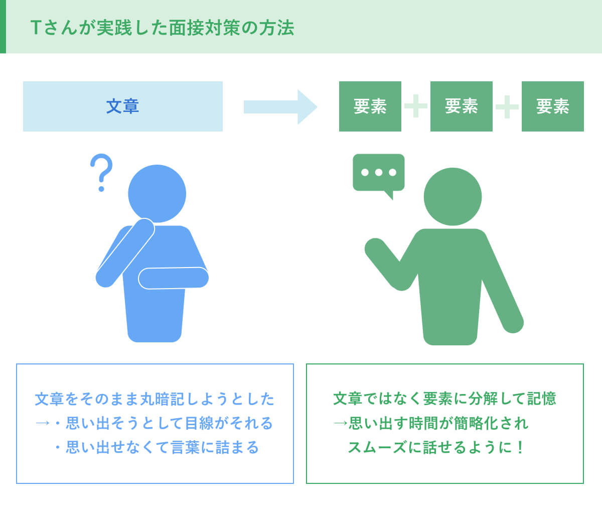 そこでアドバイザーさんに相談したところ、文章をそのまま覚えるのではなくて、いくつかの要素に分解して記憶し、細かい部分は自分の言葉で話すようにしたら良いというアドバイスをもらいました。